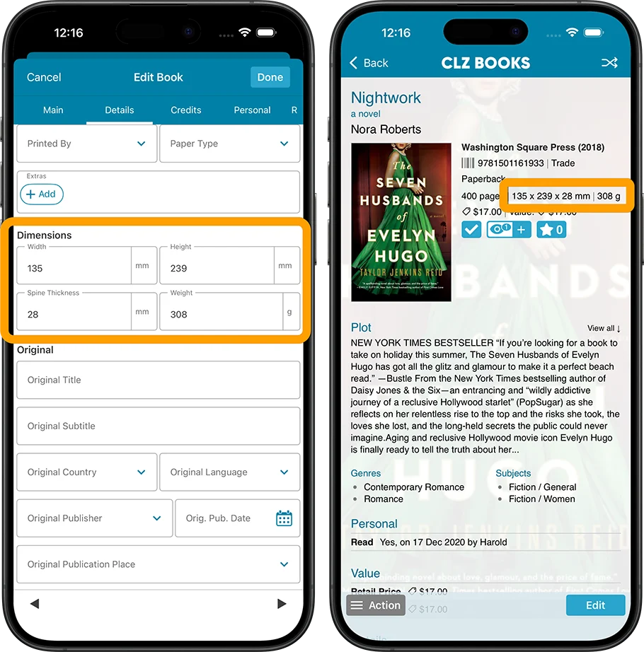 More book dimension fields: Spine Thickness and Weight