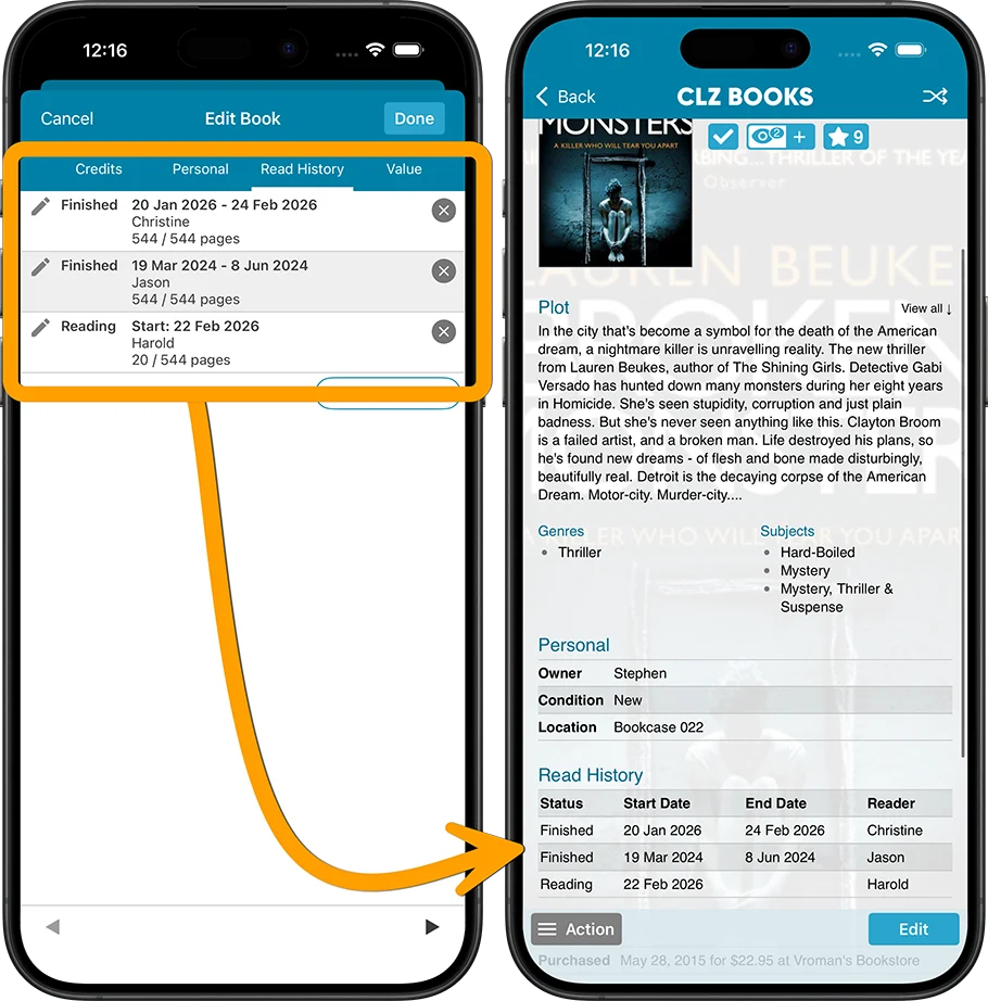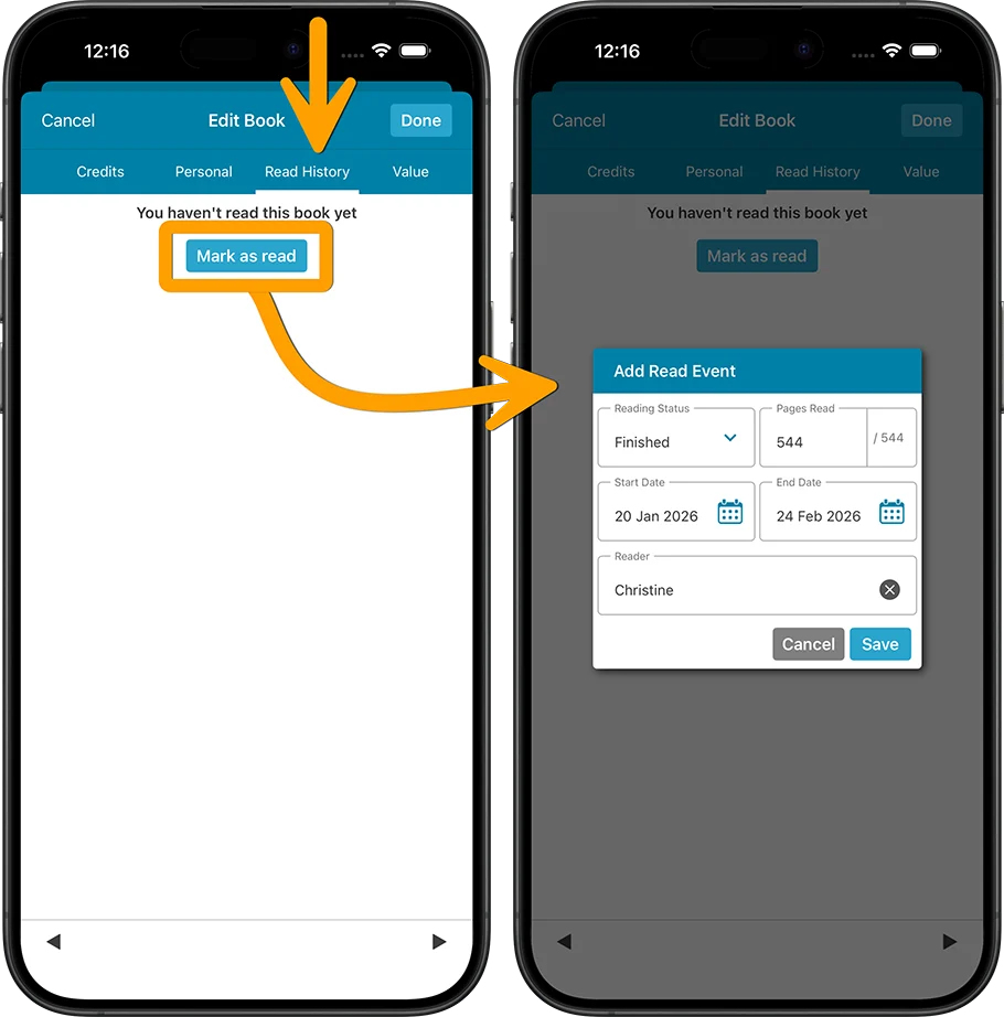 - Track your Reading History, with multiple read sessions, each having Start and End Dates, Reading Status, Reading Progress and Reader fields.