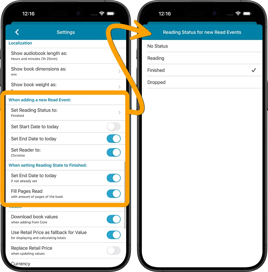 You can set this up precisely to what you like CLZ Books to do when adding a new Reading event, or when you set one to Finished. For example, you can let it auto-fill an end date when you set a reading event to “Finished”.