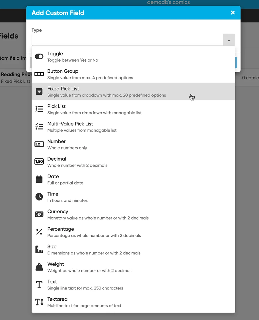 Choose from a wide range of field types. Create simple text fields, number fields, currency fields, yes/no toggles, big text areas (like Notes), even pick list fields and multi-value pick list fields.