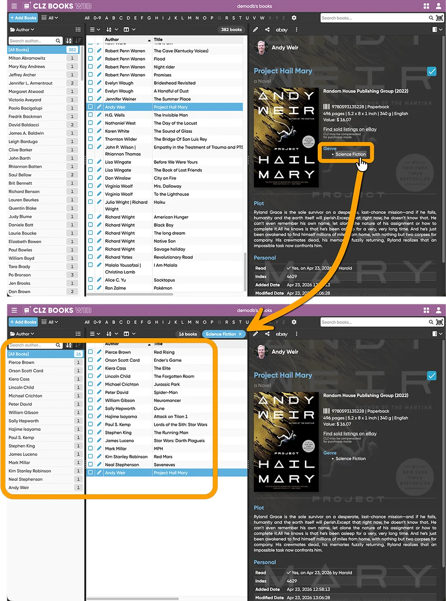 For example, click on “Science Fiction”, and CLZ Books Web will immediately show all your sci-fi book!