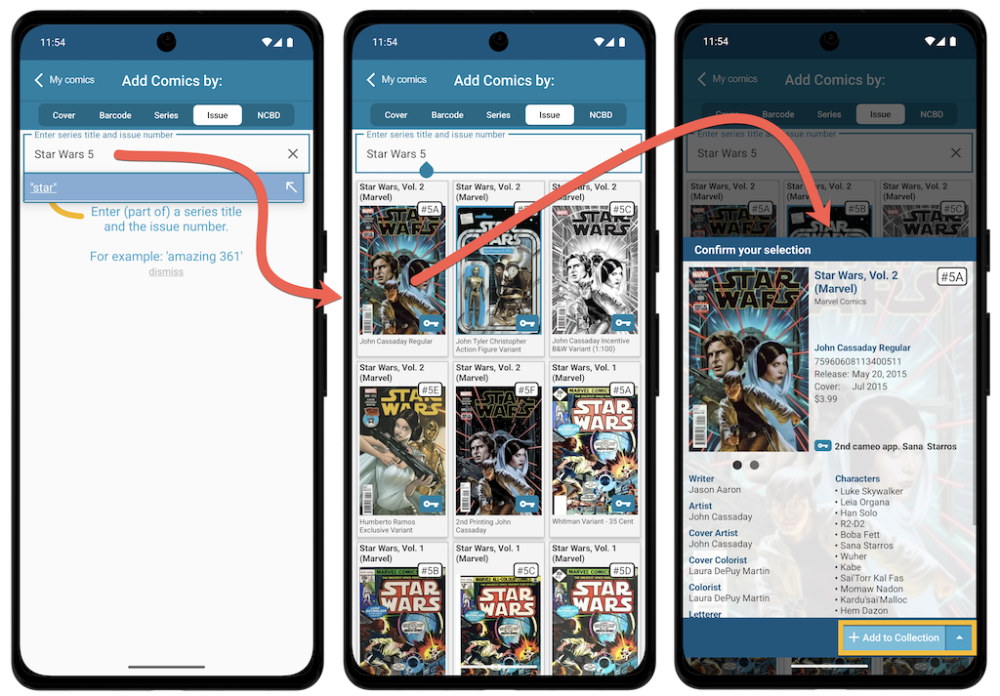 Example: You are looking for Amazing Spiderman 25. Easily fill in the entire title and issue number. Now it will show you all the amazing Spiderman 25 comics and variant covers. Choose your variant and add it to your collection!