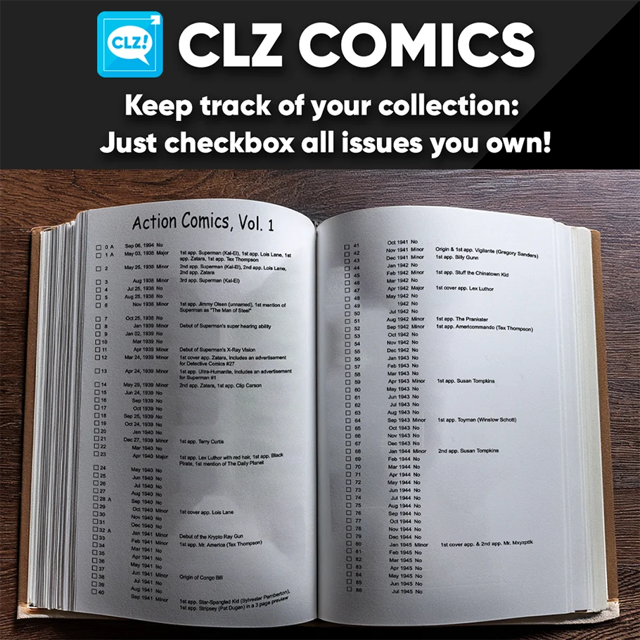 The full CLZ Core database, all series, all issues, all variants, in actual paper books for your offline browsing. - Keep track of your comic collection. All issues are listed with checkboxes, so just use a pencil to checkbox the issues you own.