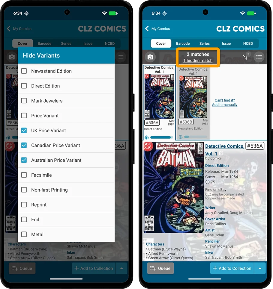 When you scan a cover while a Variant Filter is active, the bar at the top will tell you if there are any hidden matches. Tap that number to instantly show those matches anyway.