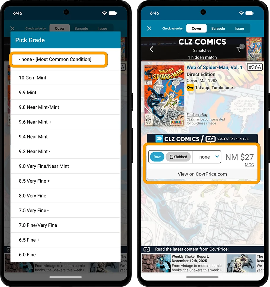 So in today’s update, we added a new “-none-” option in the Grade selector for the Check Value screen, so that you can easily check values without setting a grade. And thus get the CovrPrice value for their Most Common Condition.