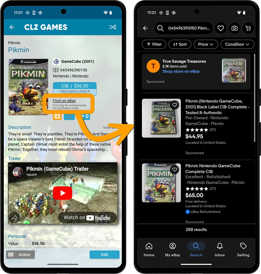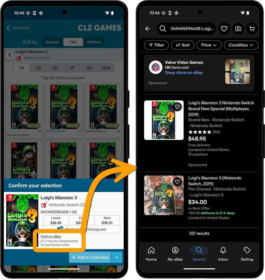 An eBay link is also available in the Add screen, while adding a game to your collection: