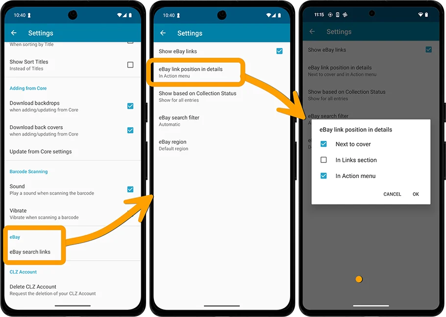 Our favorite location for the eBay link is right there in the details page, next to the cover. This location is *disabled* by default, because it may be *too* prominent for some users, but if you often use the eBay links, we strongly recommend enabling the “Next to cover” position: