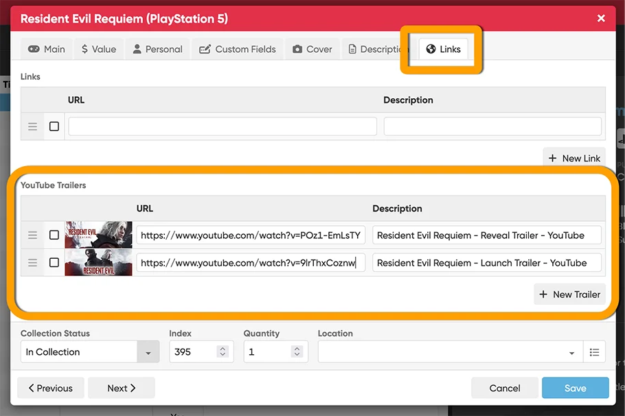 Just paste any YouTube URL into your the YouTube trailer link section (Edit Game, then click the Links tab) and CLZ Games Web automatically grabs the thumbnail image and video description for you.