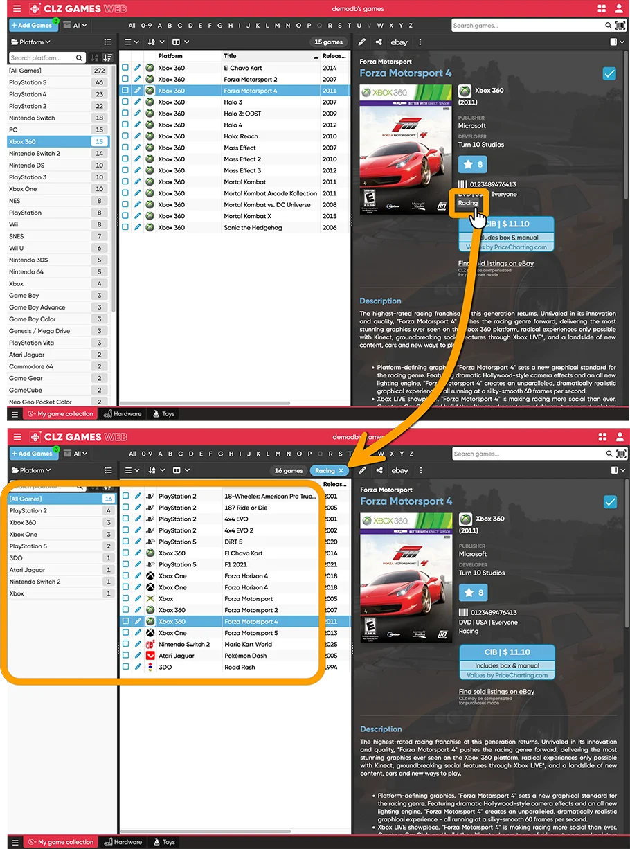 For example, click on “Racing”, and CLZ Games Web will immediately show all your racing games!