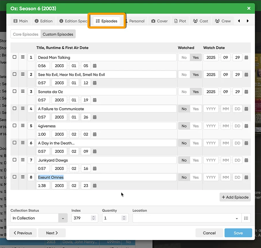 And.. for your manual entries, e.g. for TV Series that are not in CLZ Core, you can manually add your own episode lists!