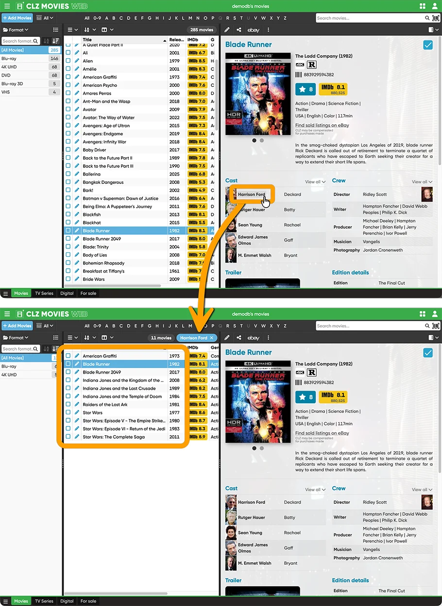 For example, click on an actor like Harrison Ford, and CLZ Movies Web will immediately show all your movies that has Harrison Ford as (one of) the actors!