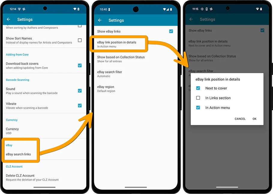 Our favorite location for the eBay link is right there in the details page, next to the cover. This location is *disabled* by default, because it may be *too* prominent for some users. But… if you often use the eBay links, we strongly recommend enabling the “Next to cover” position:
